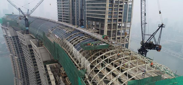 据悉,在桁架节段“上升”过程中为了确保每个吊点的同步性,提升系统自带的行程位移传感器将各个点的实时“行走”和“状态”数据传到后台电脑里,项目施工团队还运用到其它一系列的测量手段来实时监测。